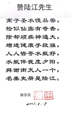 凡尊重中國古代養(yǎng)生智慧的患者,堅(jiān)持“已饑方食”和定時(shí)主動(dòng)補(bǔ)水者,均可祛病康復(fù)。如牡丹江醫(yī)學(xué)院87歲的張鵬圖飲用半年后高血壓未痊愈,陸江與他通話交流,了解他原先每日主食4兩,建議他用“已饑方食”減少主食肉食量,他理解后,將每日主食減為3兩,少吃兩塊肉,飲用一年治愈26年的冠心病和高血壓。他2003年5月31日來信說:“飲用卓康小分子團(tuán)水是根治高血壓、冠心病、糖尿病的一把金鑰匙,是填補(bǔ)醫(yī)學(xué)空白,為人類造福,應(yīng)推廣該產(chǎn)品。”