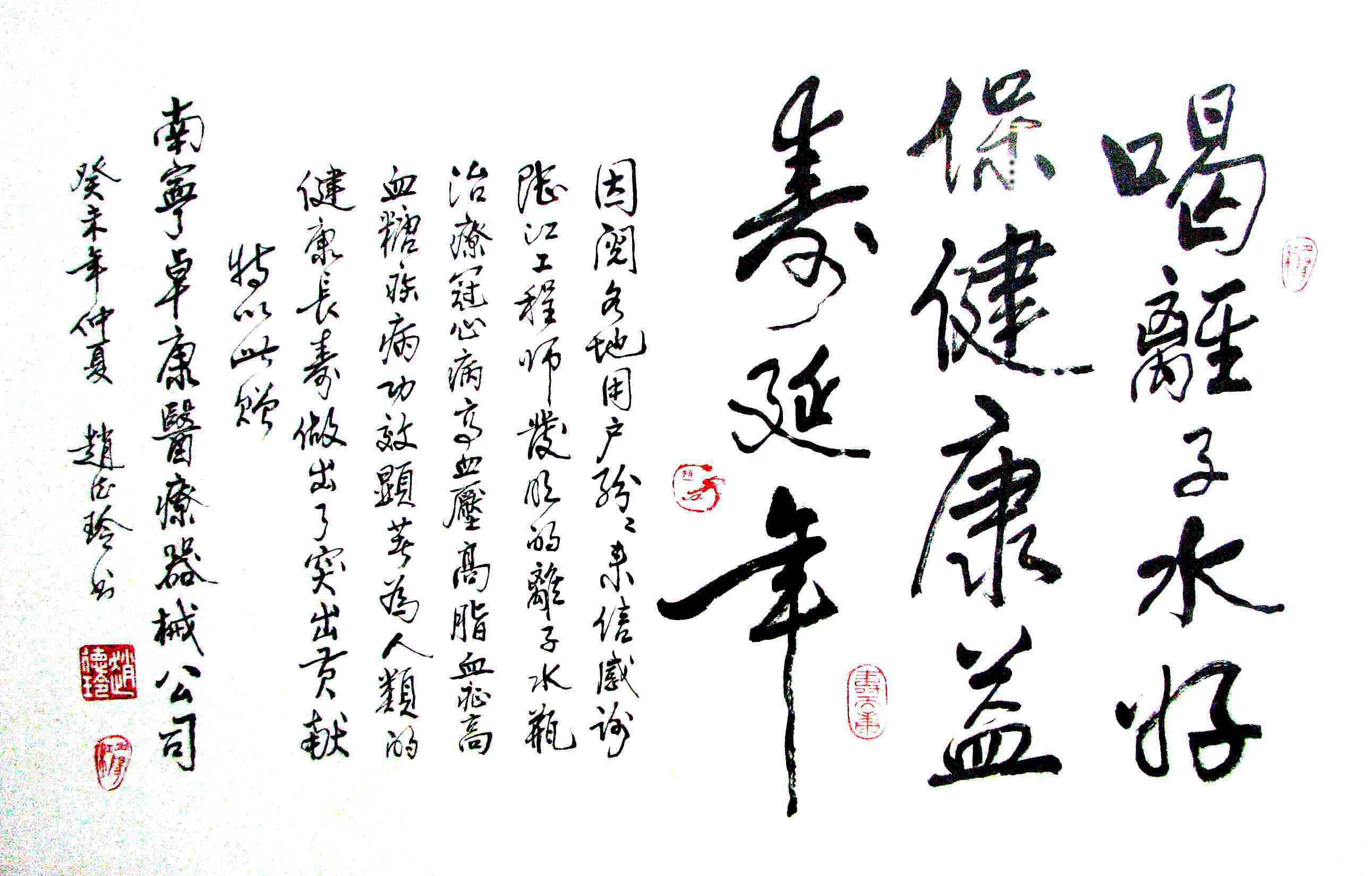 - -- 幾千年來,人類靠醫(yī)藥不能根治冠心病、高血壓和糖尿病,如想根治,那是夢想。可是,我從中國基礎(chǔ)醫(yī)學(xué)研究成果受到啟發(fā),研發(fā)了一種發(fā)明產(chǎn)品,處理出微小分子團(tuán)水讓人飲用,實(shí)現(xiàn)了人類這一夢想!患者飲用后遠(yuǎn)離了冠心病、高血壓和2型糖尿病。這一成果曾經(jīng)過臨床試用和專家鑒定,作為準(zhǔn)字號醫(yī)療器械讓廣大患者飲用,療效進(jìn)行跟蹤調(diào)查。很多患者的反饋情況令人感動(dòng),我放在公司網(wǎng)站上(nnzk.com),震撼了醫(yī)學(xué)專家,也使廣大同胞受到啟發(fā)。人們盼望飲用它給細(xì)胞補(bǔ)水,治愈多種病癥,既省錢,又安全,而且延長壽命。