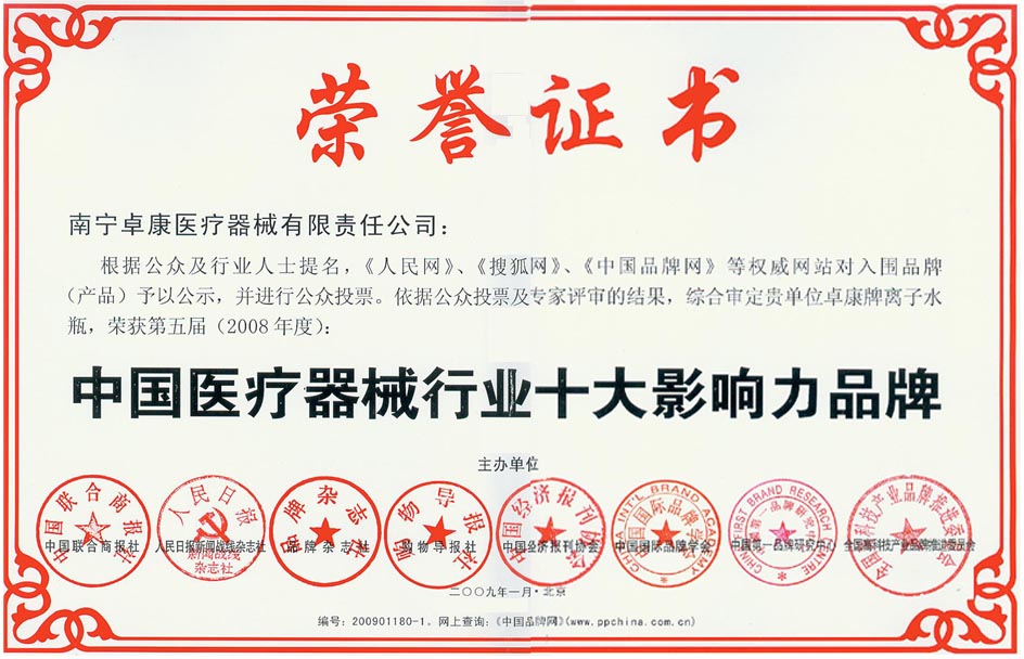 卓康牌離子水瓶榮獲中國名特優(yōu)品牌[點(diǎn)小圖見大圖] *榮獲中國醫(yī)療器械行業(yè)十大影響力品牌[點(diǎn)小圖見大圖]--------
